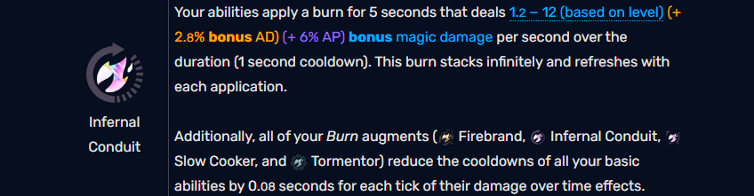 Infernal Conduit is a very good Augment on AP champions or champions that deal damage over time. Infernal Conduit applies a burn to enemies, so champions with AOE abilities and abilities that deal damage over time can benefit from taking it. You will want to pair this Augment with items that burn or deal additional damage to their enemies. It is also really good on champions that spam abilities too, as it reduces your abilities cooldowns too.