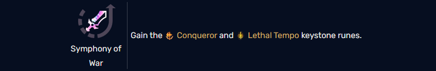 No champions in Arena Mode take Runes, but some Augments can offer some Runes to empower your champion. Symphony of War is one such Rune, and it provides Lethal Tempo and the Conqueror Runes. So any champion who takes this will have both of these Runes attached to their kit. There are different versions of this Rune too, such as Combo Master (Electrocute and Phase Rush), Demon’s Dance (Fleet Footwork and Grasp) to name a few.