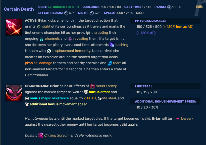Briar’s Passive gives her a ton of sustain, and as she will be auto-attacking a lot, the sustain she gets will be quite difficult to handle. Think of her like an overtuned Warwick, and we all know how annoying his sustain is!