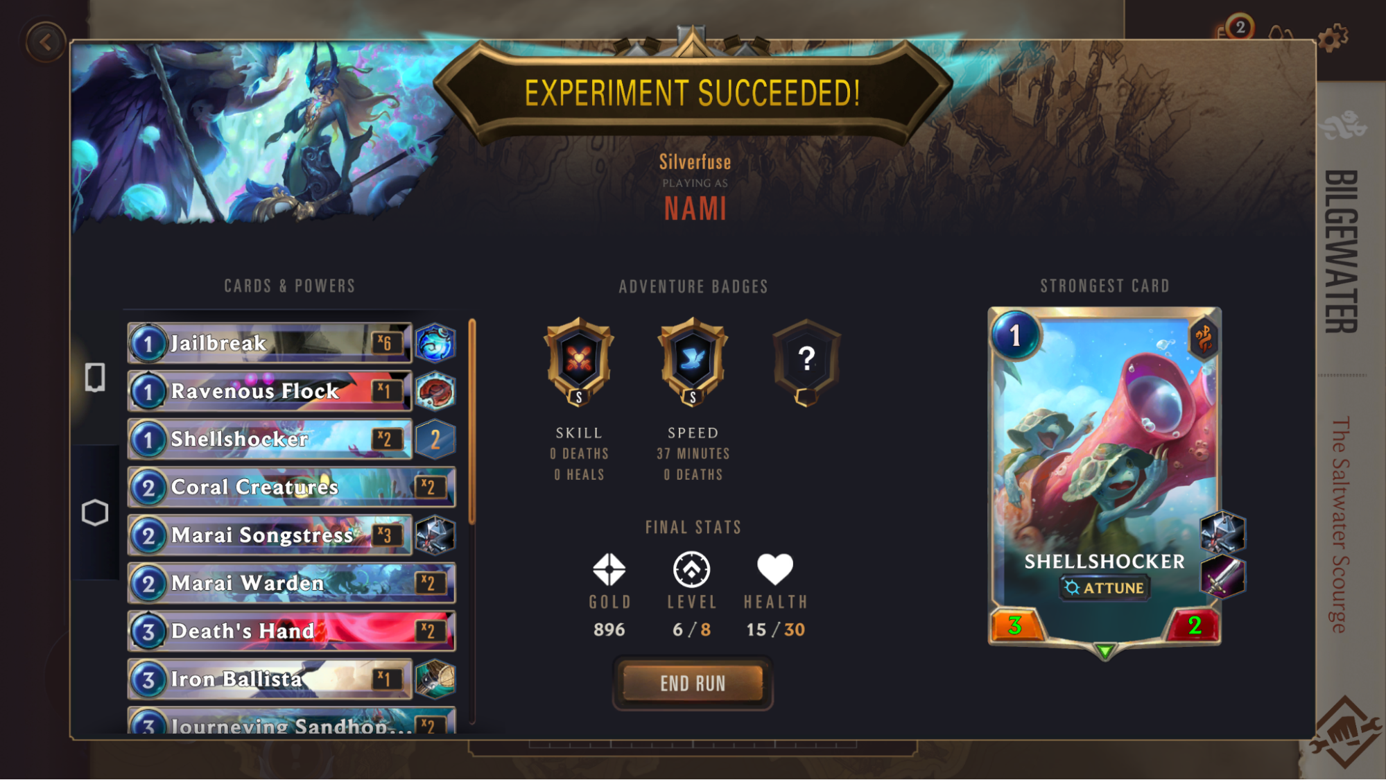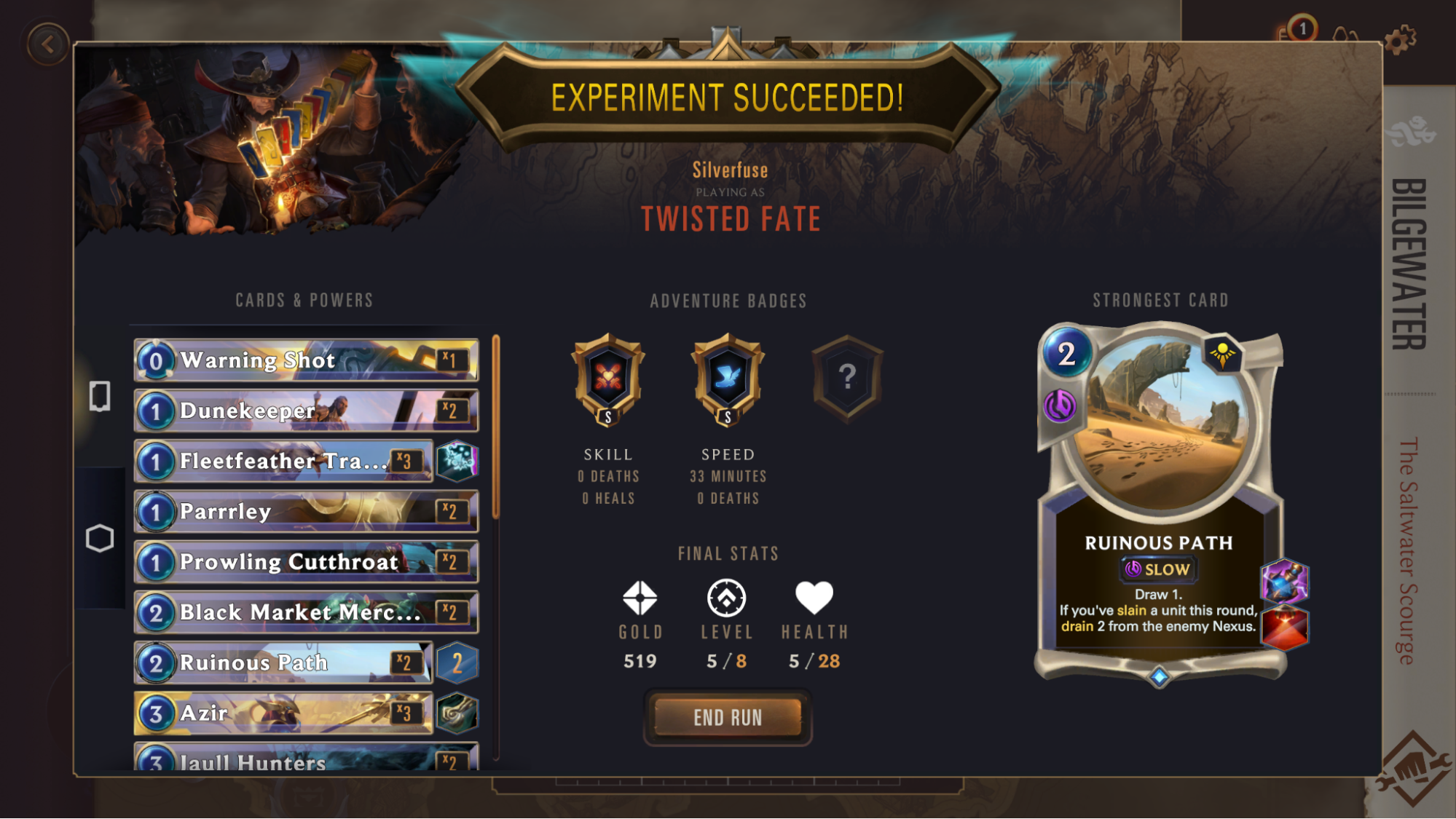 Another way besides having a strong champion to end the game is also having lots of attachments of ways to buff your cards so that you can block Gangplank without dying. I was able to do this in two runs.