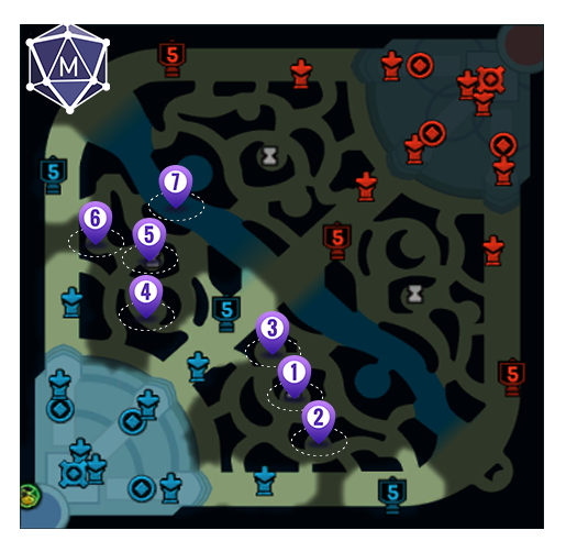 This is the recommended route when playing Skarner on the Blue side of the map. You can copy this route for the Red side as well; just flip the map around (so start Red Buff on the other side of the map instead).