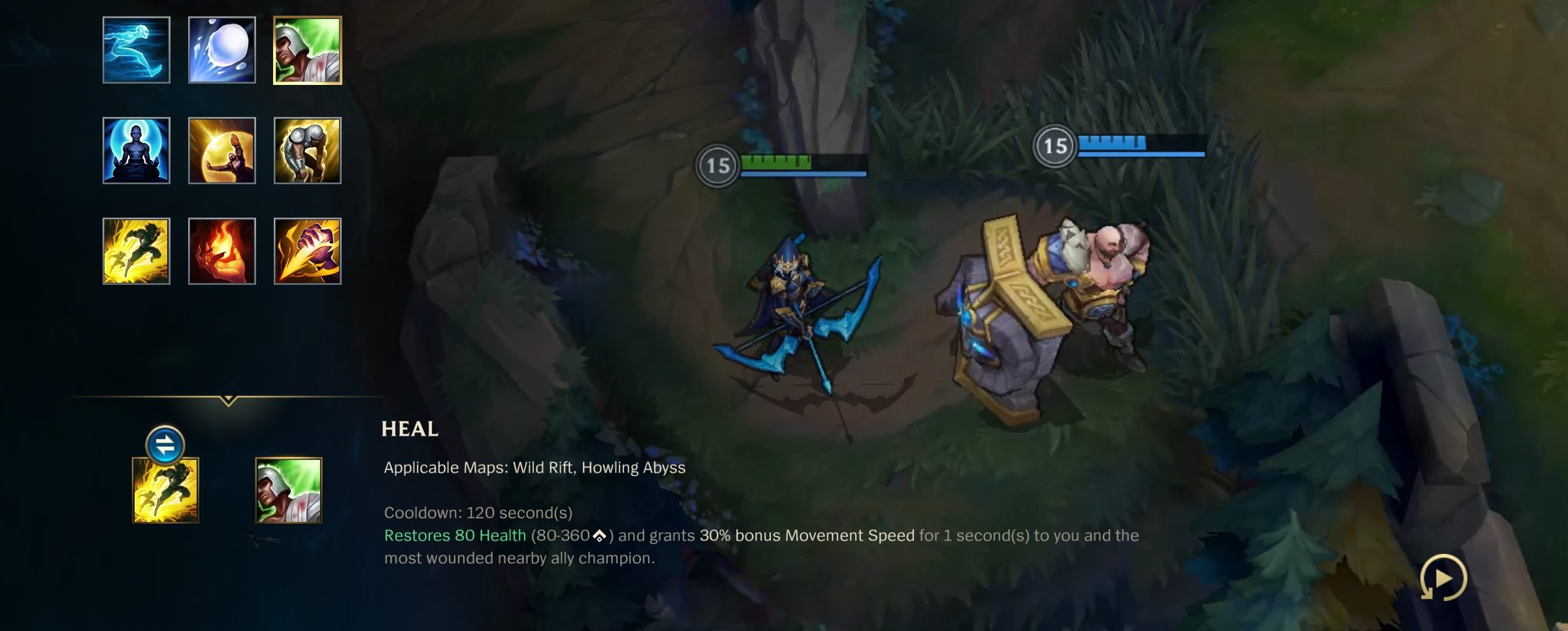 - Restore 80 − 360 (based on level) health and grants 30% bonus movement speed for 1 second to you and the most wounded nearby ally champion. Healing is halved for champions recently affected by Heal.