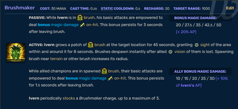 Ivern was released in 2016, and “recently” received a rework. While he is overall a lot better as he actually has range now, his W is the worst part of his kit. First of all, it used to be good because it empowered his auto-attacks and could hide things like the Dragon.